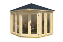 Include una porta e finestre dotate di unità vetrata e realizzate in legno lamellare, soglia in acciaio inossidabile, travi di fondazione impregnate, elementi di fissaggio e istruzioni di installazione.