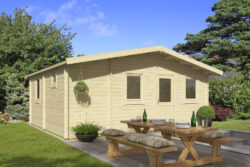 Include una porta e finestra dotate di unità vetrata e realizzate in legno lamellare, soglia in acciaio inossidabile, travi di fondazione impregnate, elementi di fissaggio e istruzioni di installazione.