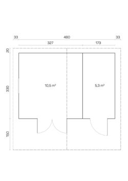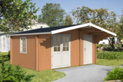 Include una doppia una porta dotata di un’unità vetrata e realizzata in legno lamellare, una porta rifinita con pannelli lamellari e una finestra con un’unità vetrata, soglia in acciaio inossidabile, travi di fondazione impregnate, elementi di fissaggio e istruzioni di installazione.