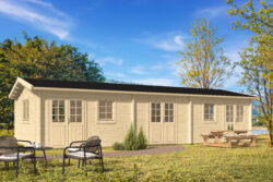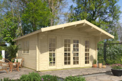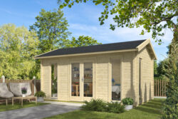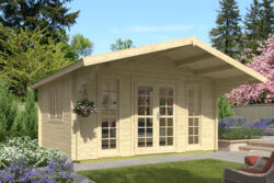 Include una doppia porta e finestre dotate di unità vetrata e realizzate in legno lamellare, soglia in acciaio inossidabile, travi di fondazione impregnate, elementi di fissaggio e istruzioni di installazione.