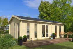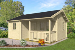 Include una porta e finestre dotate di unità vetrata e realizzate in legno lamellare, soglia in acciaio inossidabile, travi di fondazione impregnate, elementi di fissaggio e istruzioni di installazione.
