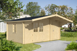 Include una doppia una porta dotata di un'unità vetrata e realizzata in legno lamellare, una porta rifinita con pannelli lamellari e una finestra con un'unità vetrata, soglia in acciaio inossidabile, travi di fondazione impregnate, elementi di fissaggio e istruzioni di installazione.